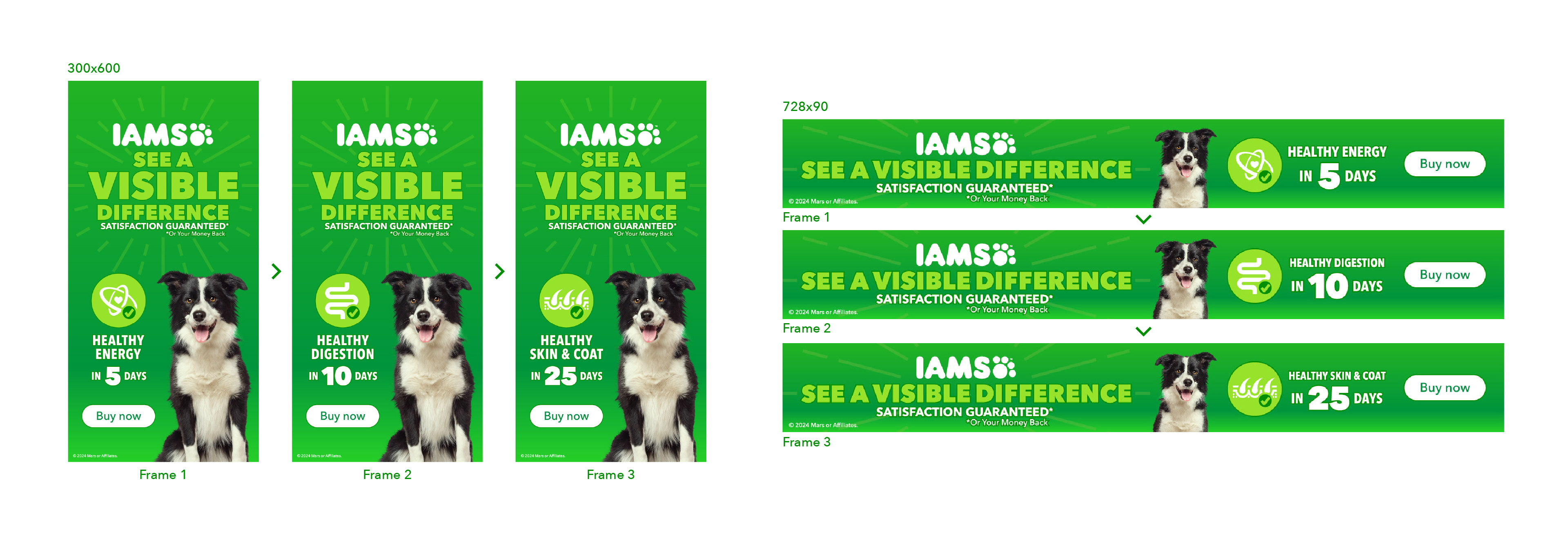 IAMS tasked us with creating a new umbrella program and toolkit for their "See A Visible Difference" campaign. We branded the program, as well as a comprehensive playbook for retailers and third parties to execute against. When choosing IAMS, pet parents can see a difference in their pet's health in a matter of days, so we created a look and feel that reflects the positive change in your pet in such a short time. This program was an always-on campaign that we built with the ability to live alongside their quarterly activations.